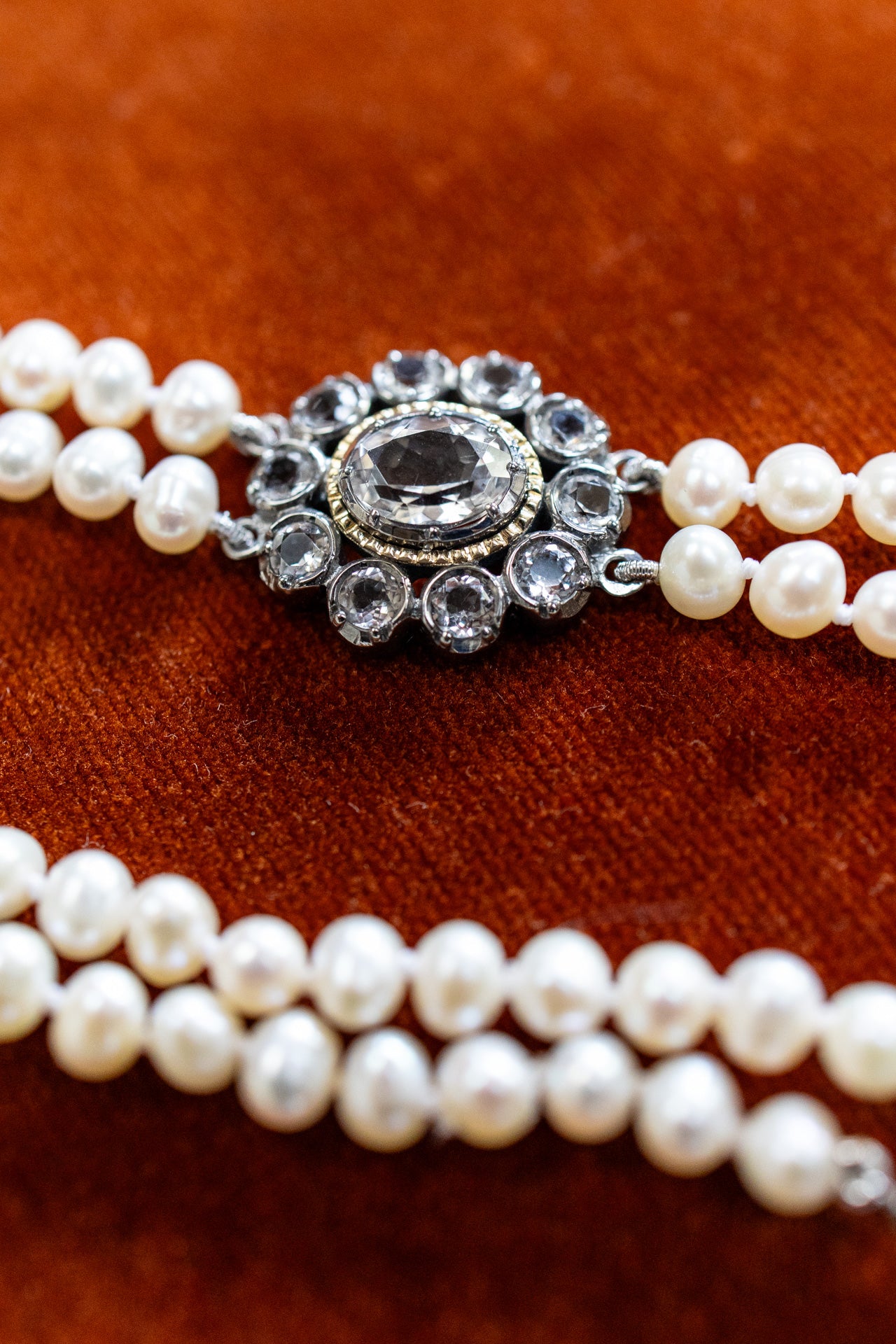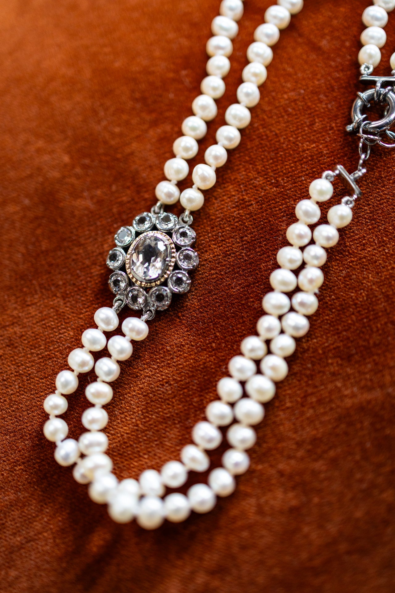 gargantilha prata e ouro, cristais de rocha e pérolas de água doce